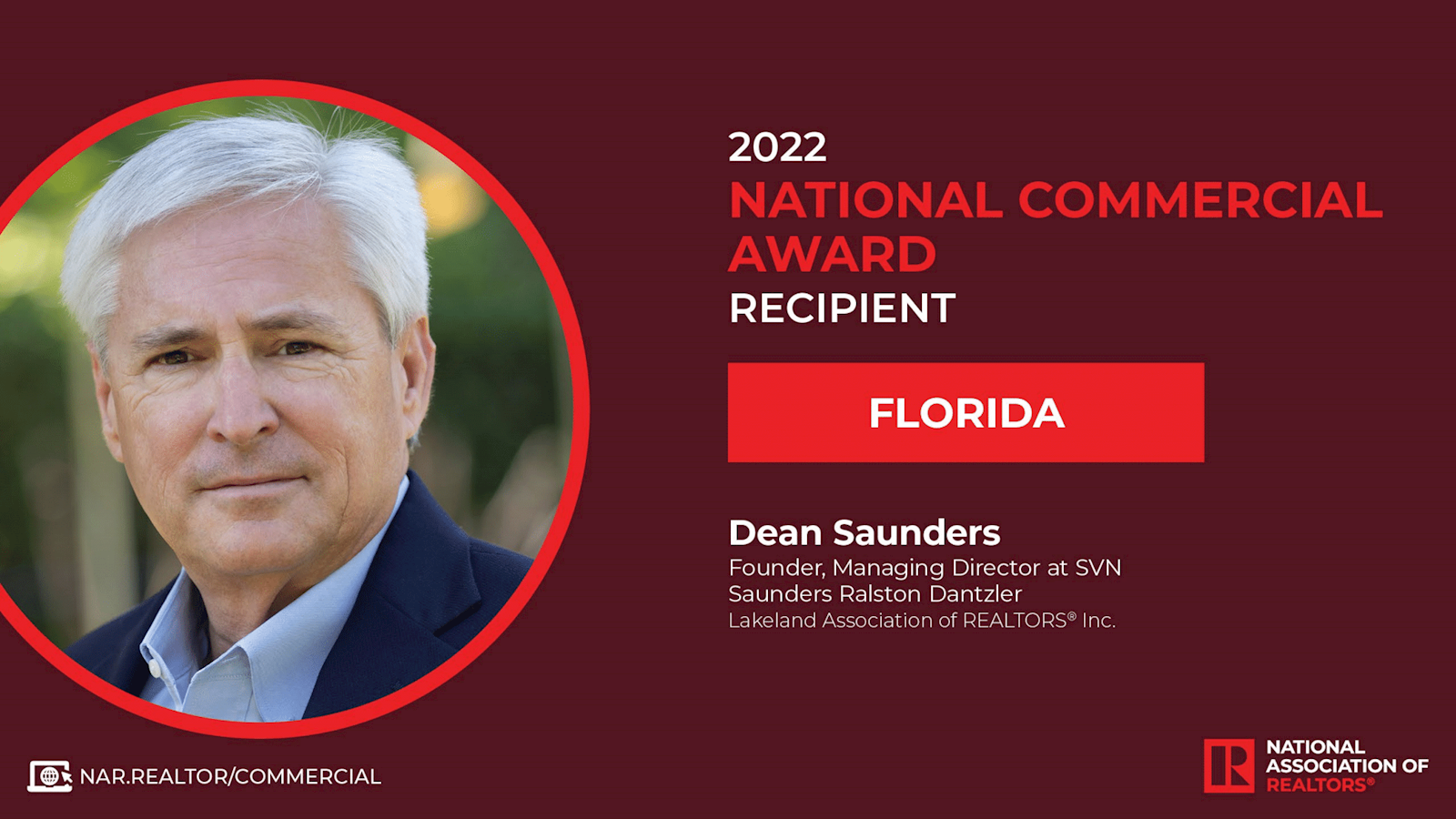 LAKELAND, FL, December 27, 2022 - Since 2006, The National Association of REALTORS®’ National Commercial Award has honored over 700 commercial agents who have received significant recognitions for their market contributions. Dean Saunders, ALC, CCIM, Founder & Managing Director of SVN | Saunders Ralston Dantzler was recently honored with the 2022 award.