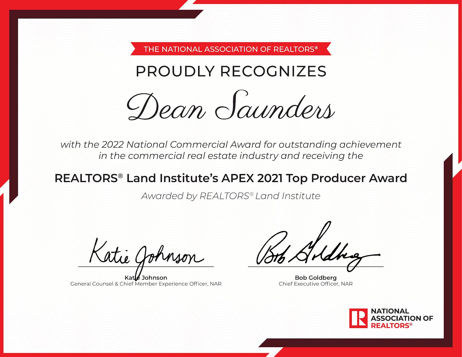 The National Commercial Award recognition program honors REALTORS® who received an award or recognition for their exceptional service and contributions to the commercial real estate industry. Saunders was nominated to this list of honorees for his reception of the REALTORS® Land Institute’s APEX 2021 Top Producer Award. The Top Producer Award specifically honors the REALTOR® with the highest overall qualifying transaction volume across the entire nation.